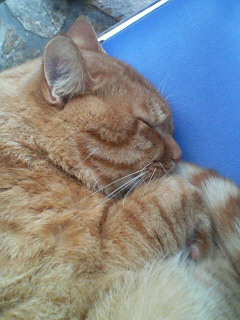 会員002がしつこくつんつんしても、全く起きる気配も無い茶トラの親分猫!どうやら、ずっとお外での生活をしているみたい。チャトラン専用の青いパイプ椅子の上にうずくまって、椅子の下には猫用の缶詰発見。そして、僕が思うには、おいしいお肉をいつももらってるんだろうな〜と!