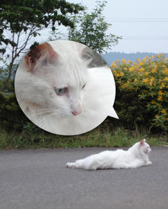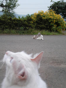 チェ「カメラ目線だニャ!町行くヒトにごはんをもらってごきげんなのかな?」